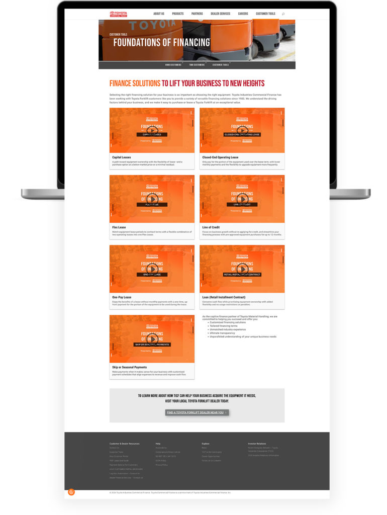 Toyota Industries Commercial Finance (TICF) is excited to announce the launch of our newest initiative, Foundations of Financing. This latest initiative is focused on helping you provide customers with more information on the various financing solutions TICF offers.
