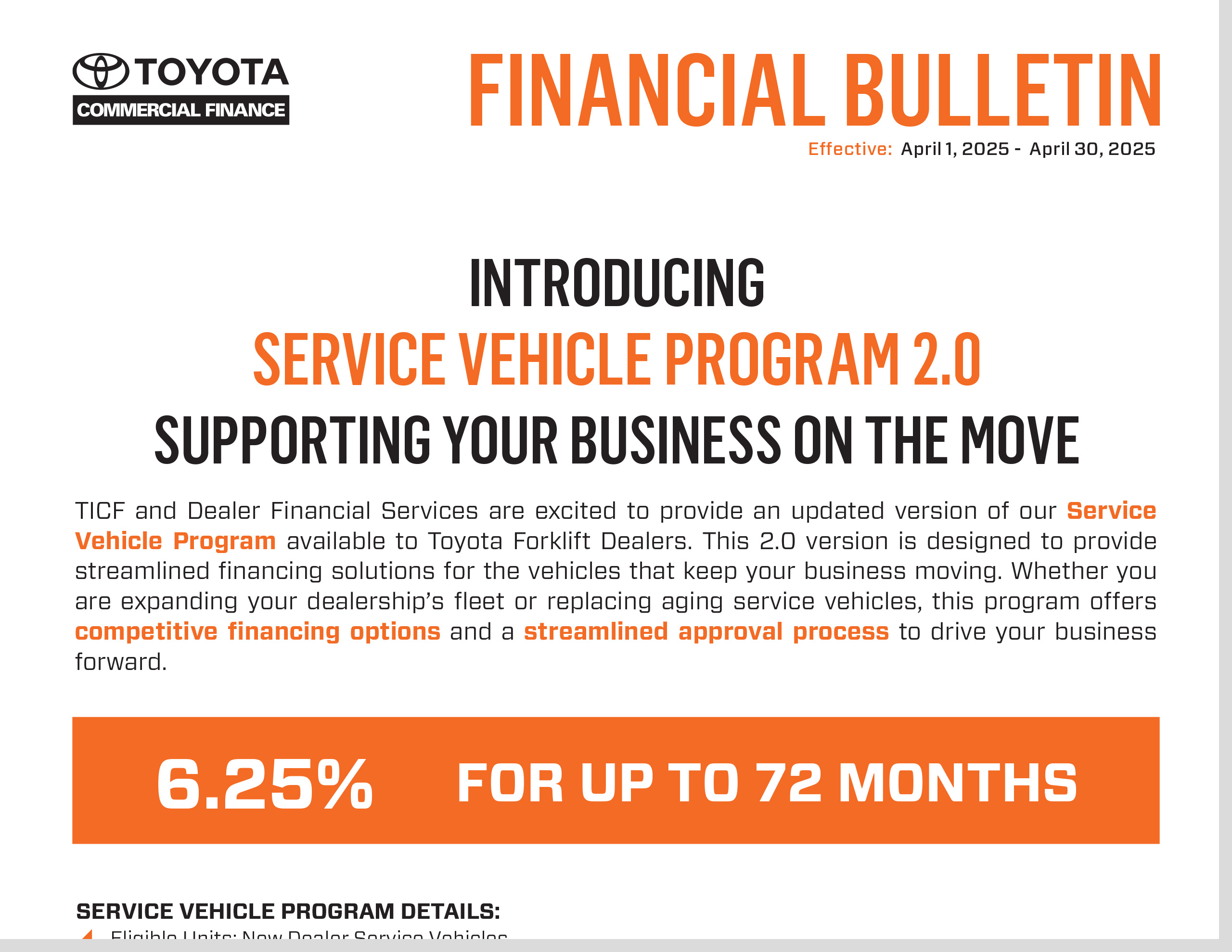 Additionally, we are proud to announce a new Service Vehicle line designed to provide streamlined financing solutions for the vehicles that keep your business moving. Whether you are expanding your dealership’s fleet or replacing aging service vehicles, this program offers competitive financing options and a streamlined approval process to drive your business forward.