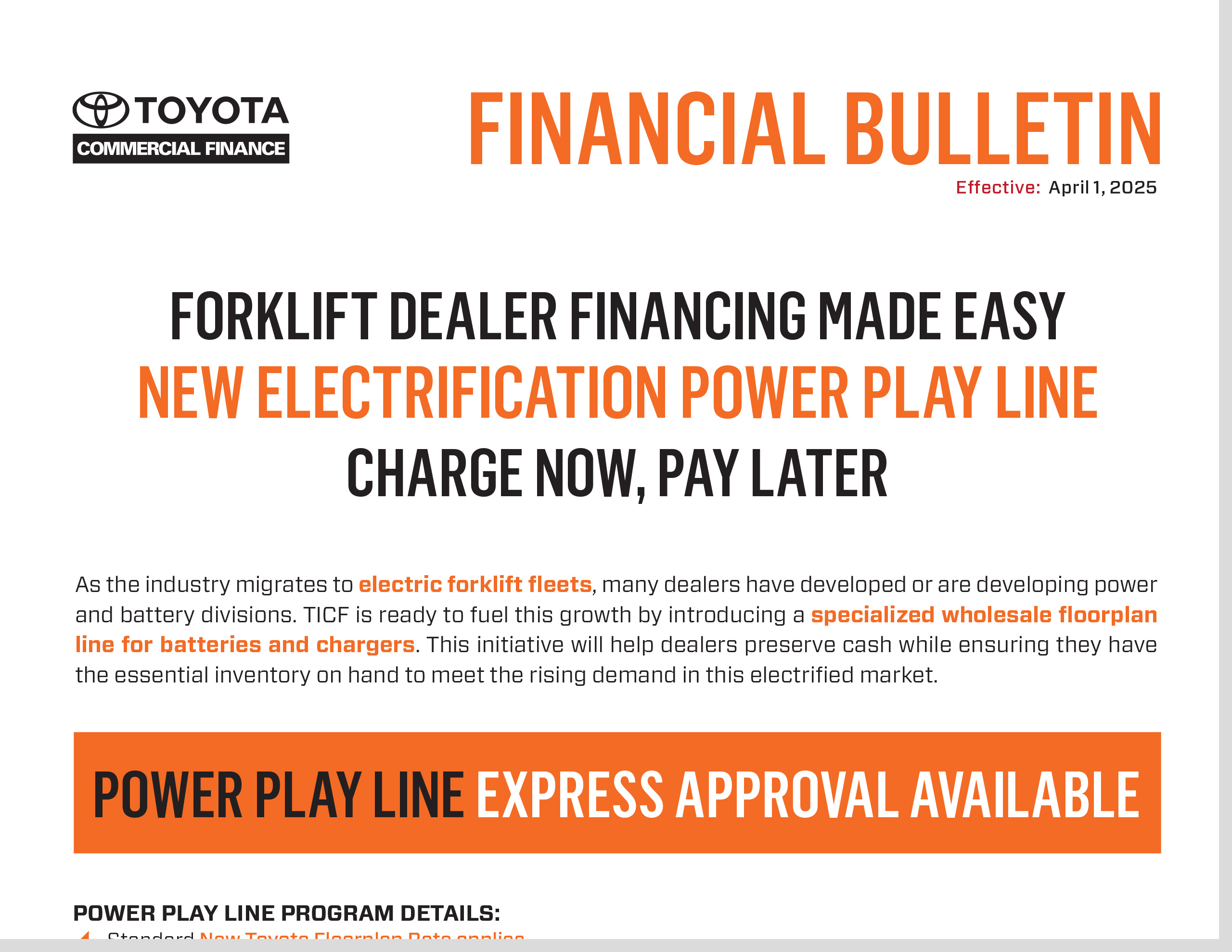 In this newsletter, you’ll find details about our newly launched programs designed to support your growth and success. We are thrilled to introduce our new Electrification Floorplan line, tailored to meet the demands of the evolving market. As the industry migrates to electric forklift fleets,, many dealers have developed or are developing power and battery divisions. TICF is ready to fuel this growth by introducing a specialized wholesale floorplan line for batteries and chargers. This initiative will help dealers preserve cash while ensuring you and your team have the essential inventory to meet the rising demand in this electrified market.